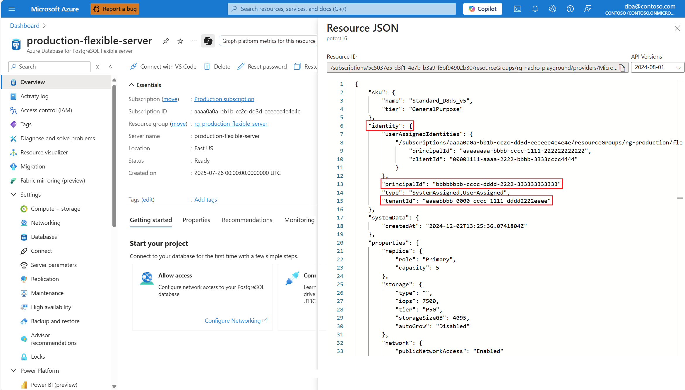 在打开的“资源 JSON”面板中,找到“标识”属性,在其中可以找到系统分配的托管标识的 principalId 和 tenantId。