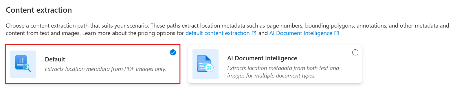 对于内容提取,可以通过 Azure AI 搜索选择默认提取,也可以通过 Foundry Tools 中的 Azure 文档智能进行增强提取。 下表描述了这两种提取方法。