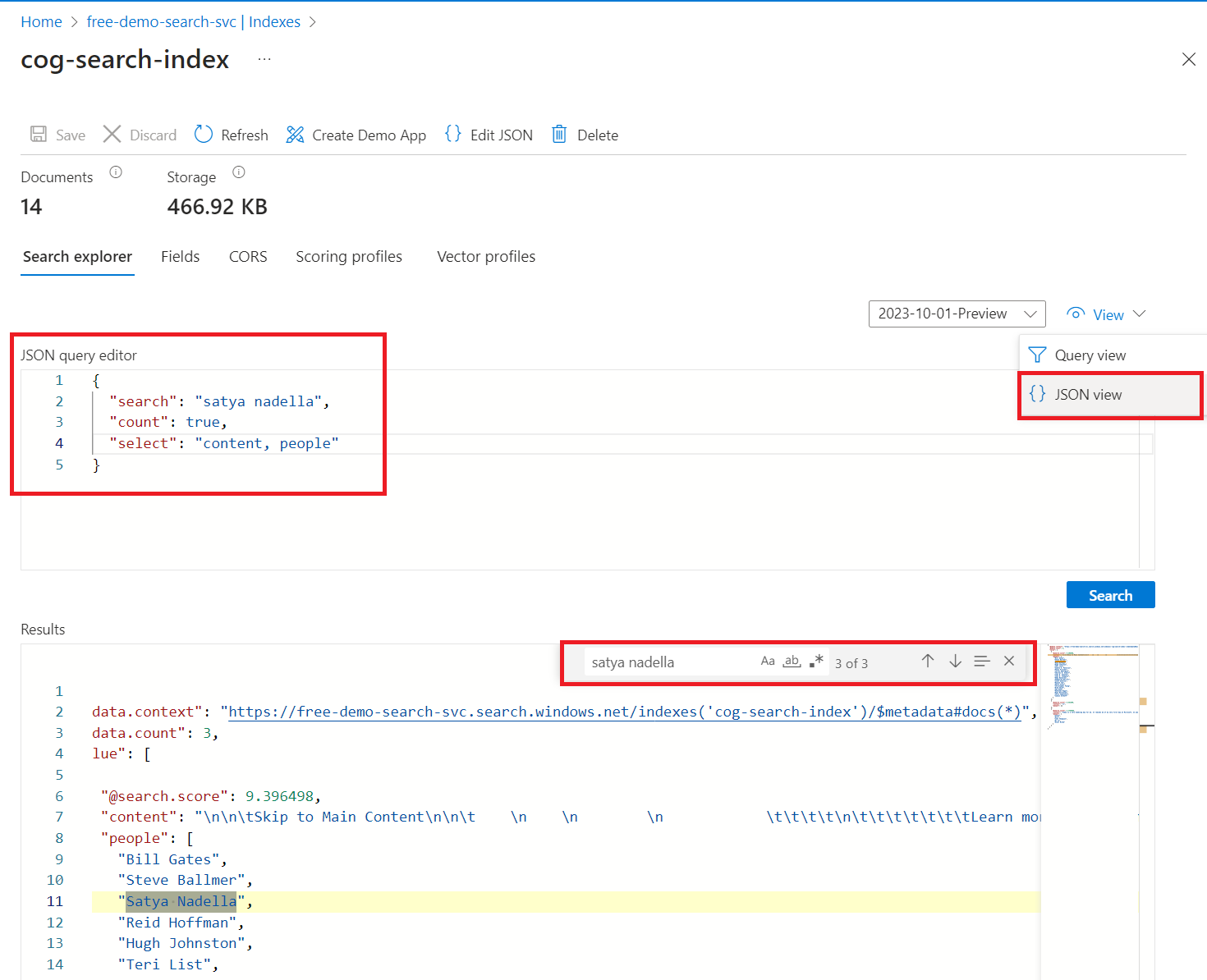 随后会返回详细的 JSON 格式的结果,这些结果可能难以阅读,尤其是在大型文档中。 下面是在此工具中搜索的提示: