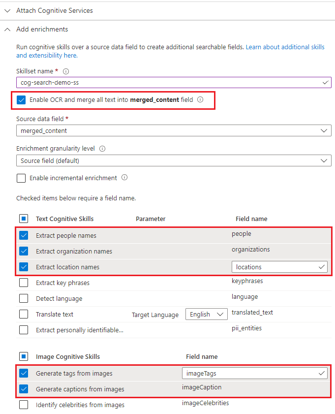 下一步是配置 AI 扩充以调用 OCR、图像分析和实体识别。