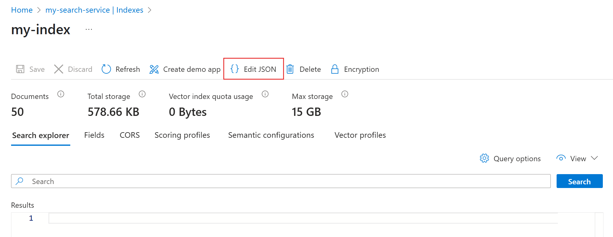 在索引页上,选择 “编辑 JSON” 以查看其完整定义。