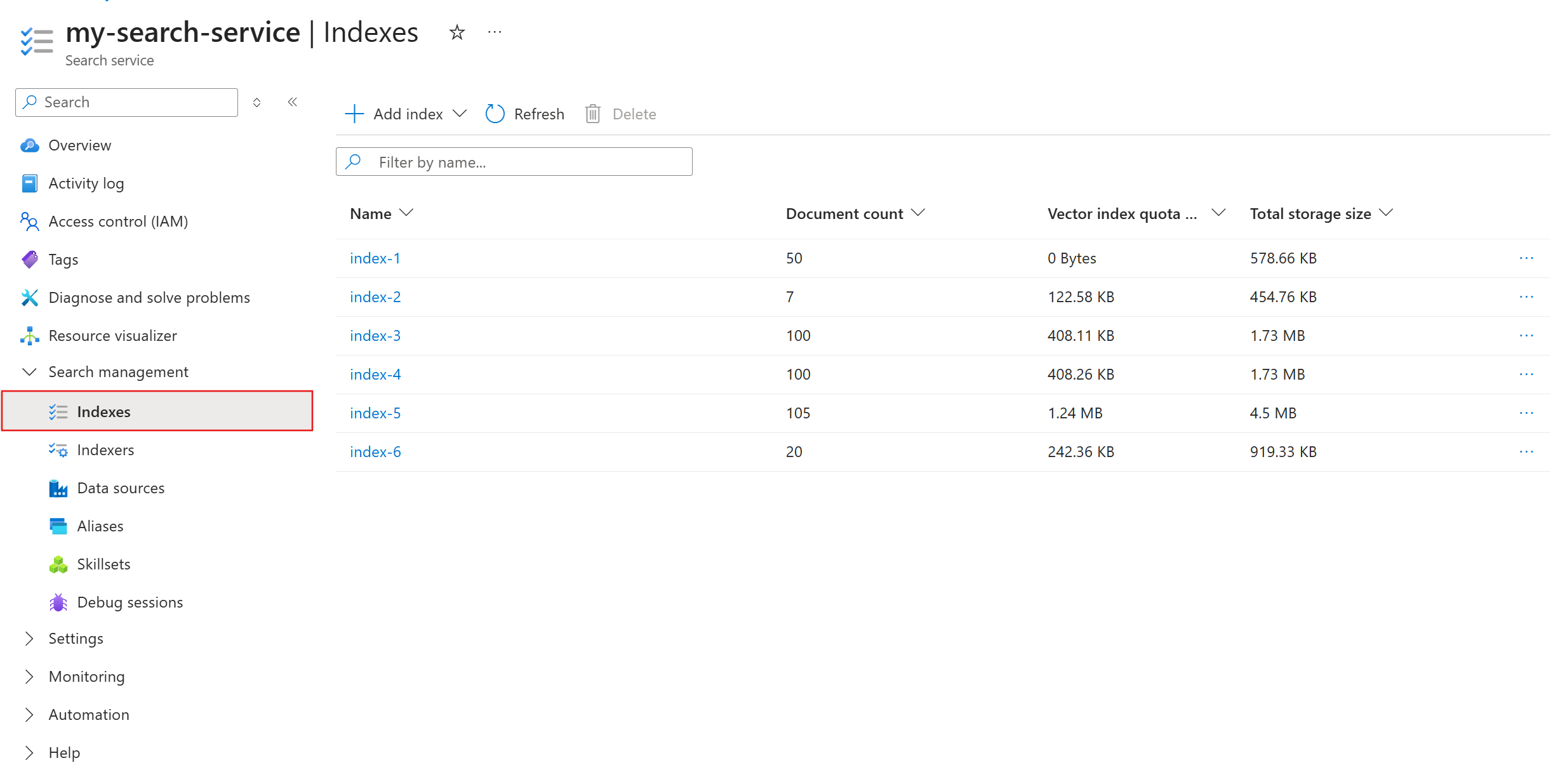 默认情况下,索引按名称按升序排序。 可以通过选择相应的列标题,按 名称、 文档计数、 矢量索引配额使用情况或 总存储大小 进行排序。