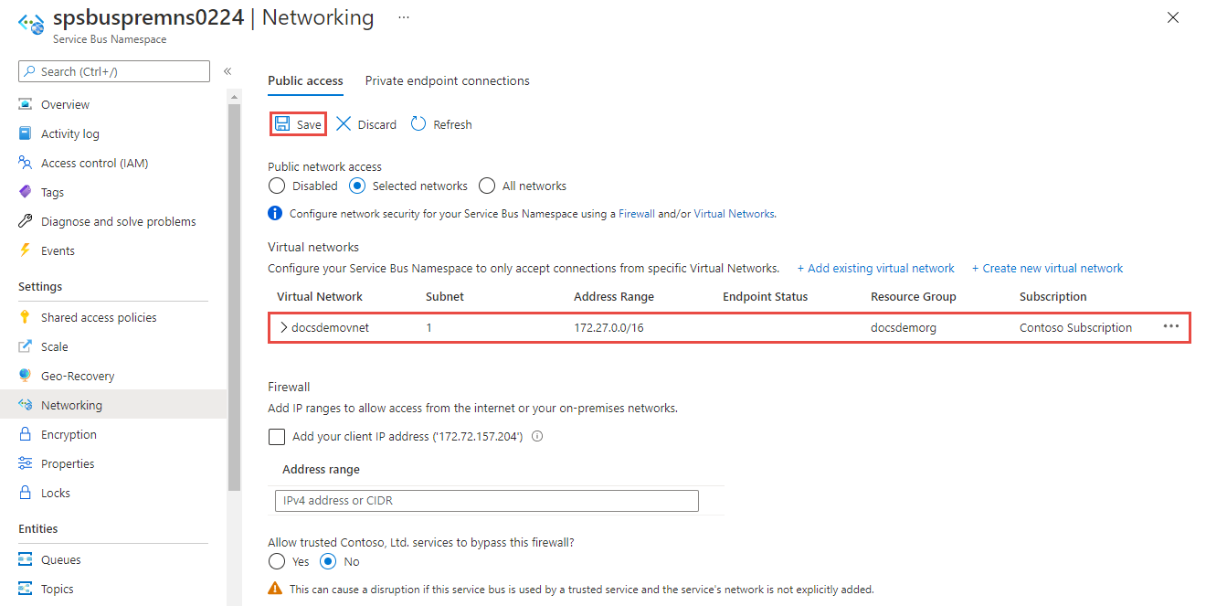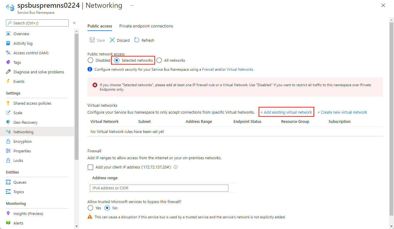 如果你在此页上选择了“所选网络”选项并且未添加至少一个 IP 防火墙规则或虚拟网络,则可以通过公共 Internet(使用访问密钥)访问该命名空间。