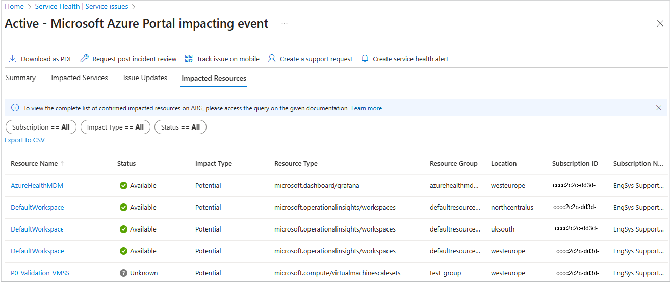 | 影响类型 | 指示资源是已确认受到影响还是可能受到影响: 已确认:资源受到服务问题的影响。 查看“摘要”部分,了解可用于修正问题的任何操作项。 潜在:资源不受影响,但它可能会受到影响,因为它属于遇到服务问题的服务或区域。 查看“资源运行状况”列,确保一切按计划运行。 |