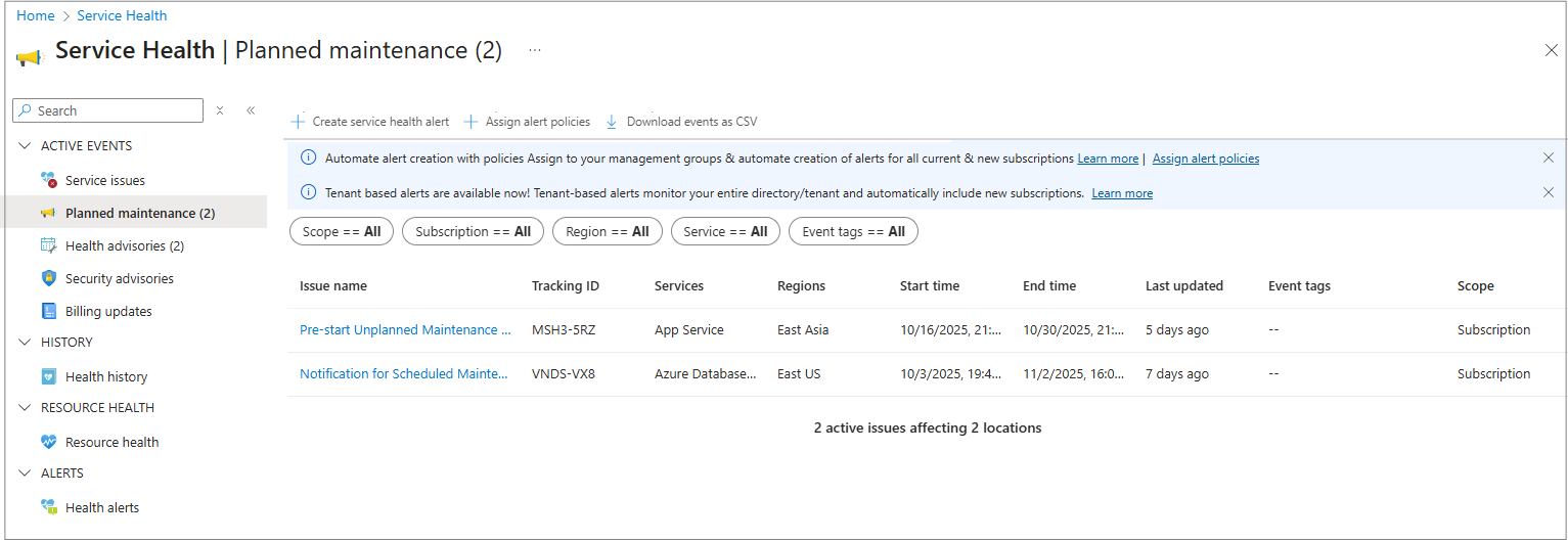 Azure 服务运行状况中的“计划内维护”窗格是 Azure 门户中的一个专用部分,可让你了解即将进行的维护活动。 它突出显示可能影响 Azure 资源的事件,帮助你提前做好准备。