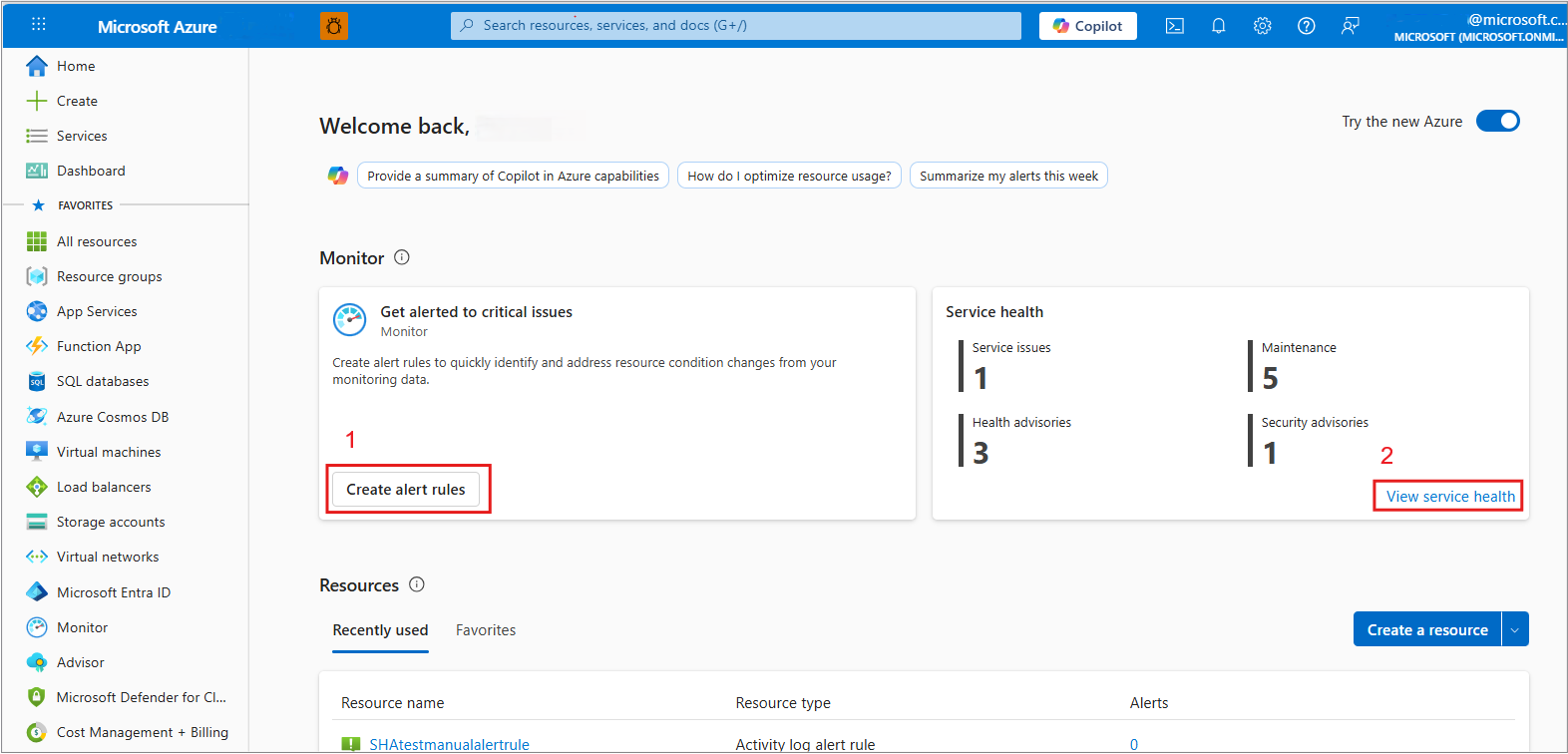 从“监视”屏幕中选择“ 创建警报规则 ”,直接在 Azure 中创建警报规则。在服务运行状况门户中: