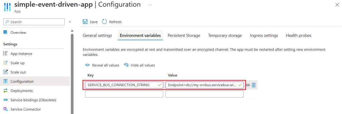 在“配置”页上,选择“环境变量”选项卡,输入 SERVICE_BUS_CONNECTION_STRING 作为“密钥”,粘贴服务总线连接字符串作为“值”,然后选择“保存”。