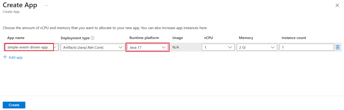 在“创建应用”页上,为“应用名称”输入 simple-event-driven-app,然后为“运行时平台”选择“Java 17”。