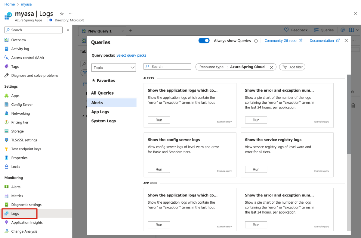 转到 Azure Spring Apps 实例的“概述”页,然后选择“日志”以检查应用的日志。