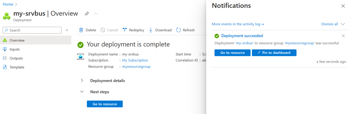 在工具栏上选择“通知”图标(铃铛)以监视部署过程。 完成部署后,可以选择“固定到仪表板”,以便在 Azure 门户仪表板上为此服务创建磁贴作为前往此服务的“概述”页的快捷方式。 选择“转到资源”以打开服务的“概述”页。