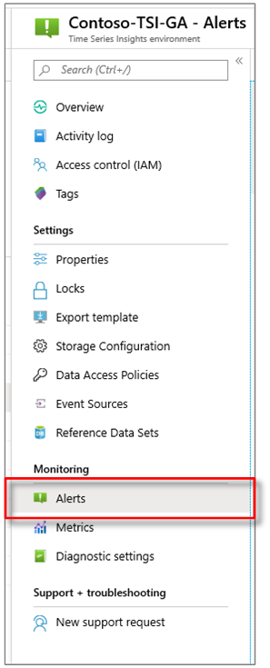 在 Azure 门户中,选择 Azure 时序见解环境。 然后选择“警报” 。