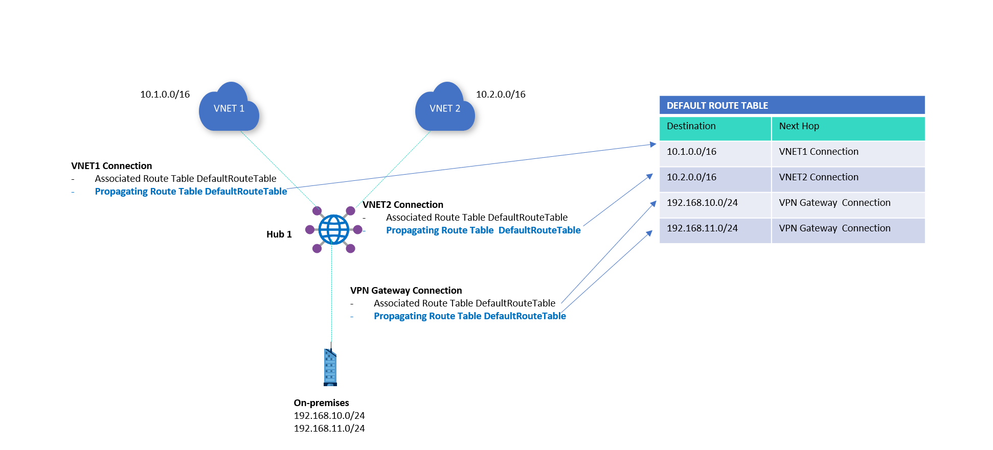 连接将路由动态传播到路由表。 在 VPN 连接、ExpressRoute 连接或 P2S 配置连接中,使用 BGP 将路由从虚拟中心传播到本地路由器。 路由可以传播到一个或多个路由表。