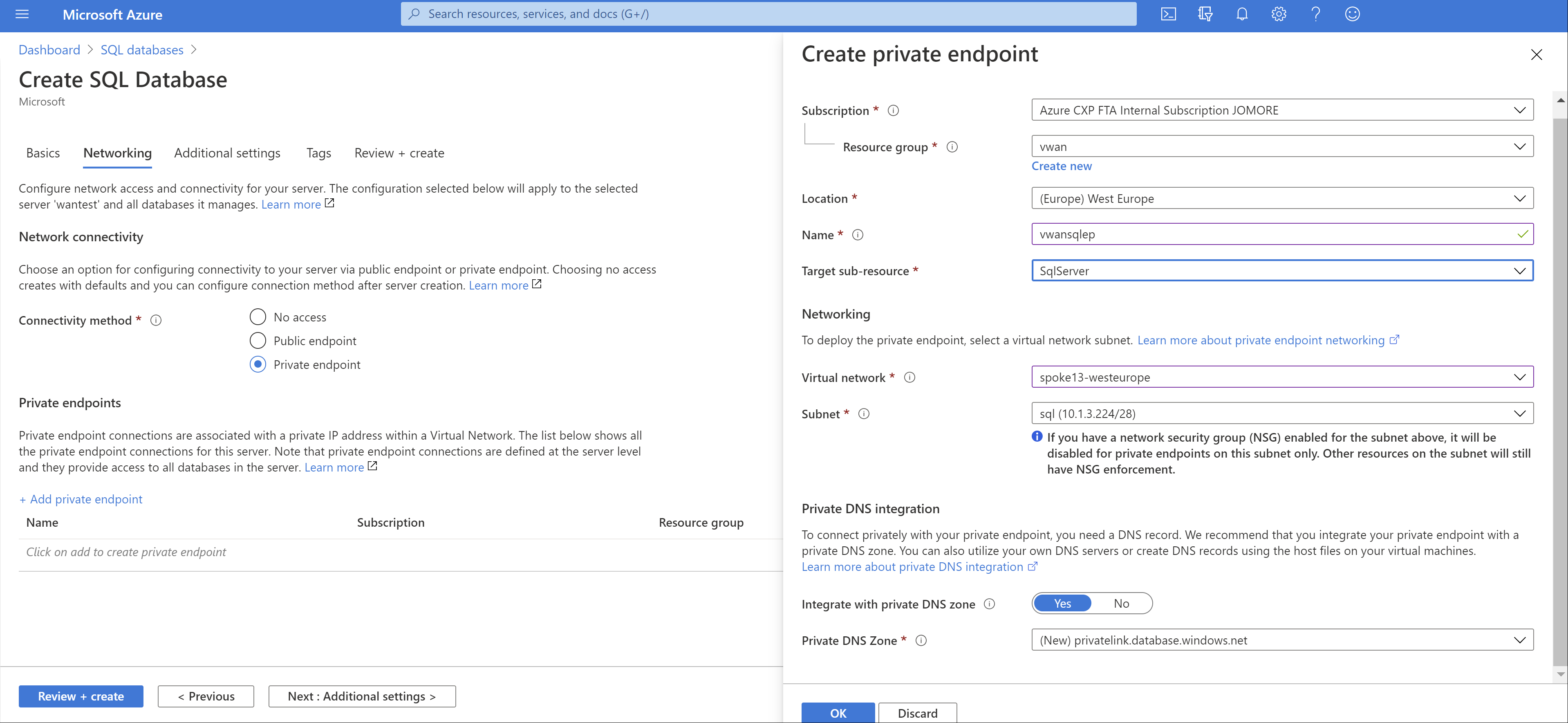 - 如果从 VNet 连接到专用终结点,则可以使用通过 Azure SQL 数据库创建的同一专用区域。