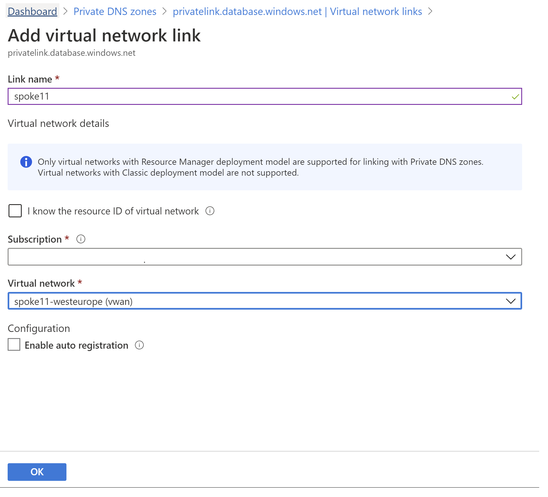 在此示例中,我们从其他 VNet 进行连接。 首先将专用 DNS 区域附加到这个新的 VNet,使其工作负荷能够将 Azure SQL 数据库完全限定的域名解析为专用 IP 地址。 此操作通过将专用 DNS 区域链接到新的 VNet 来完成: