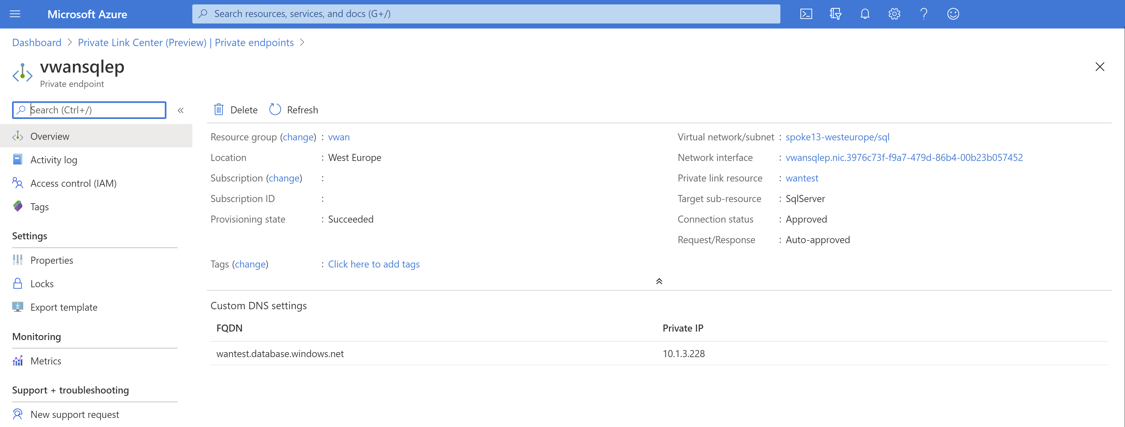 Name: wantest.privatelink.database.chinacloudapi.cn