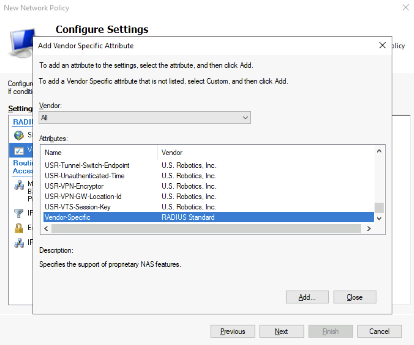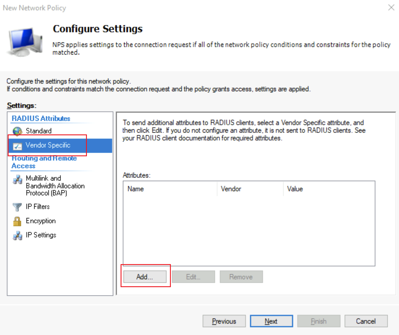 在“配置设置”页上,对于“RADIUS 属性”,请突出显示“特定于供应商”,然后单击“添加”。