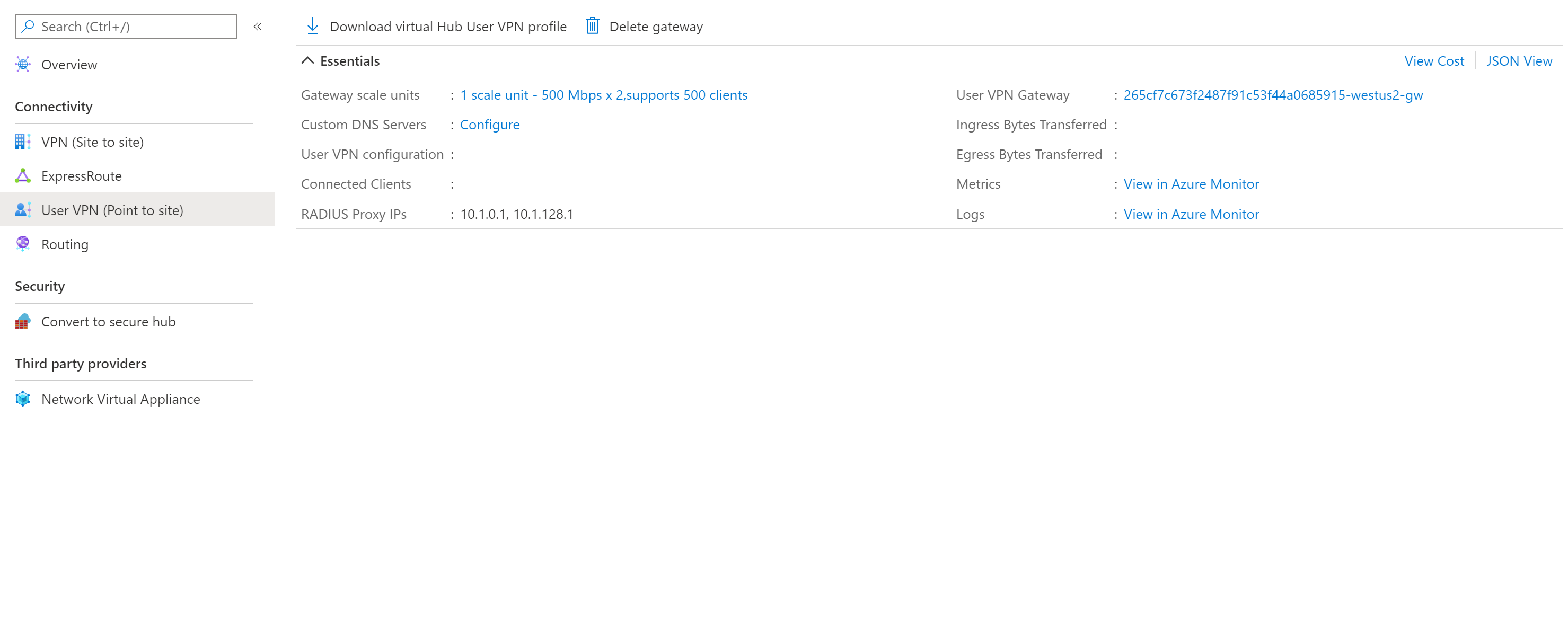 创建用户 VPN 网关后转到网关,并记下 RADIUS 代理 IP 字段。 RADIUS 代理 IP 是用户 VPN 网关发送到 RADIUS 服务器的 RADIUS 数据包的源 IP。 因此,RADIUS 服务器需要配置为接受来自 RADIUS 代理 IP 的身份验证请求。 如果 RADIUS 代理 IP 字段为空或无,请将 RADIUS 服务器配置为接受来自中心地址空间的身份验证请求。