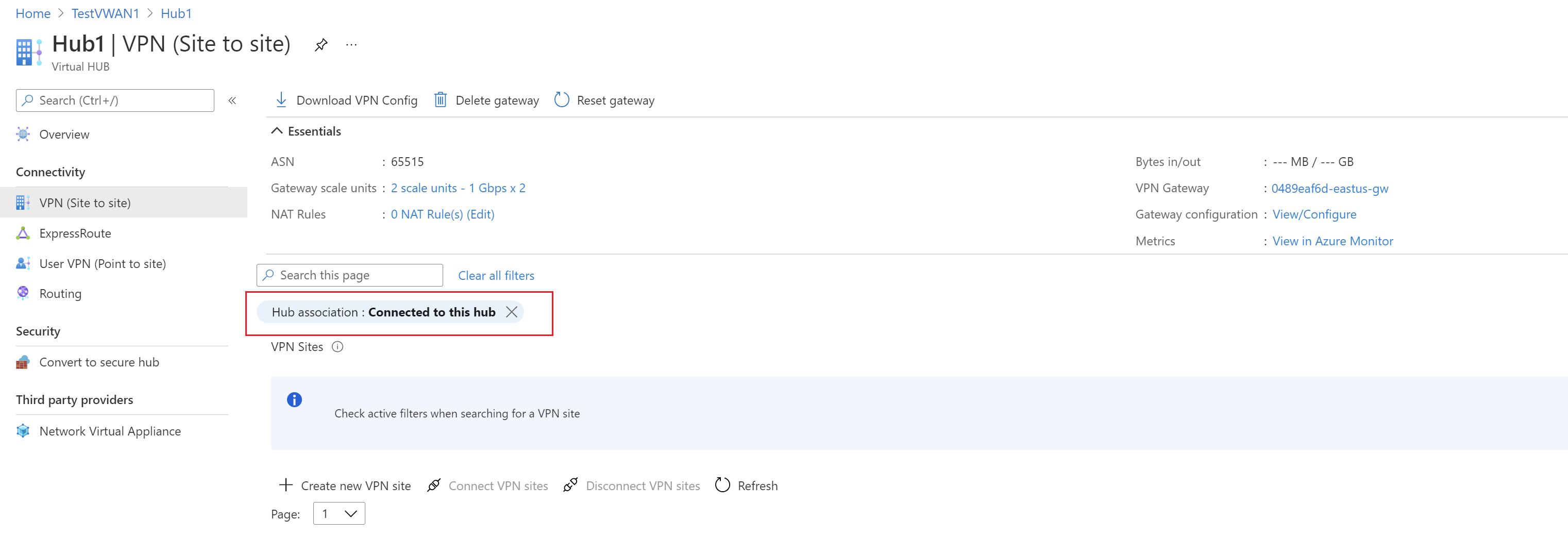 从“虚拟 WAN”页转到“中心”-> 你的虚拟中心 ->“VPN (站点到站点)”页。
