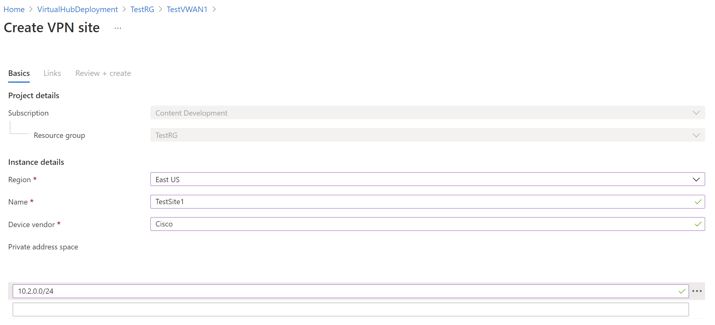 VPN 设备页上的说明不是针对虚拟 WAN 编写的,但你可以使用配置文件中的虚拟 WAN 值来手动配置 VPN 设备。