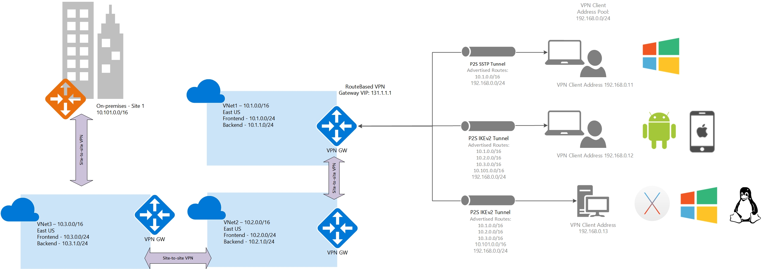 Windows 客户端可以访问 VNet 和其他分支机构 (Site1),但必须将到 Site1 的路由手动添加到客户端。 非 Windows 客户端可以访问 VNet 和本地分支机构。