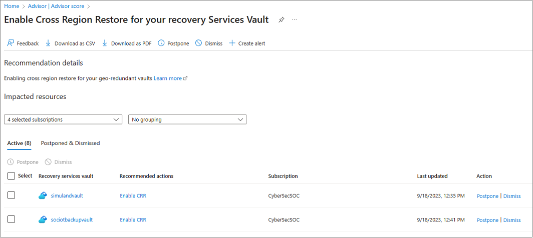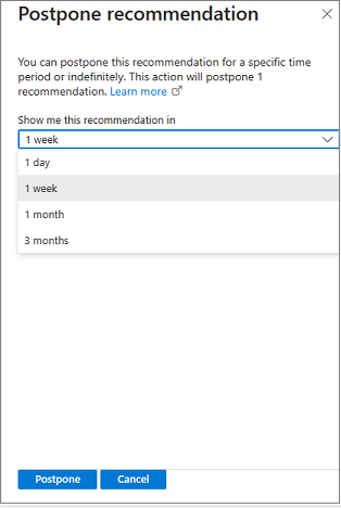 可以查看建议详细信息,例如建议的操作和受影响的资源。 还可以查看解决方案选项(包括推迟或关闭建议)。