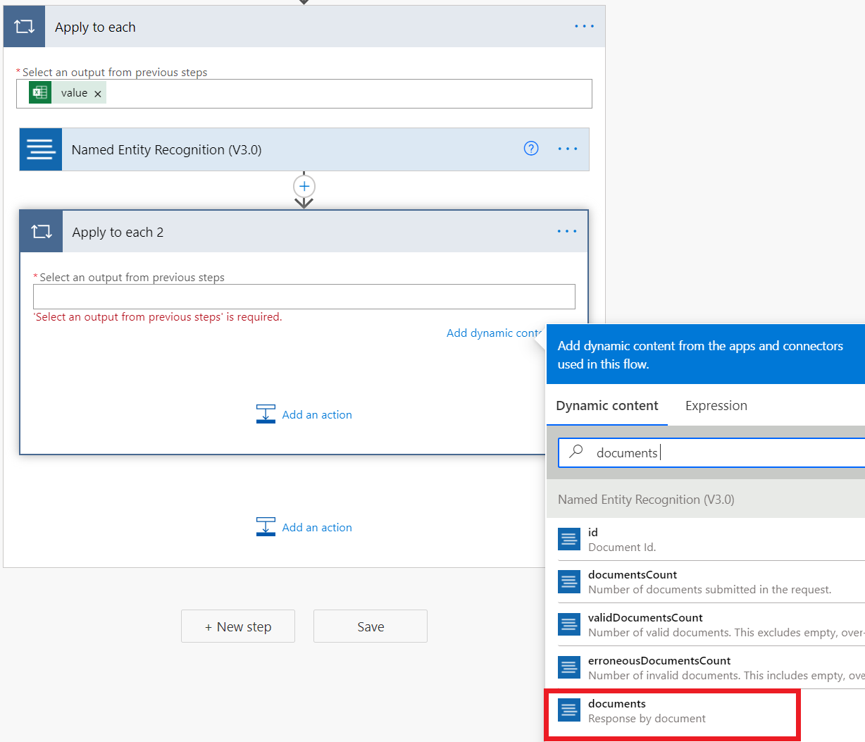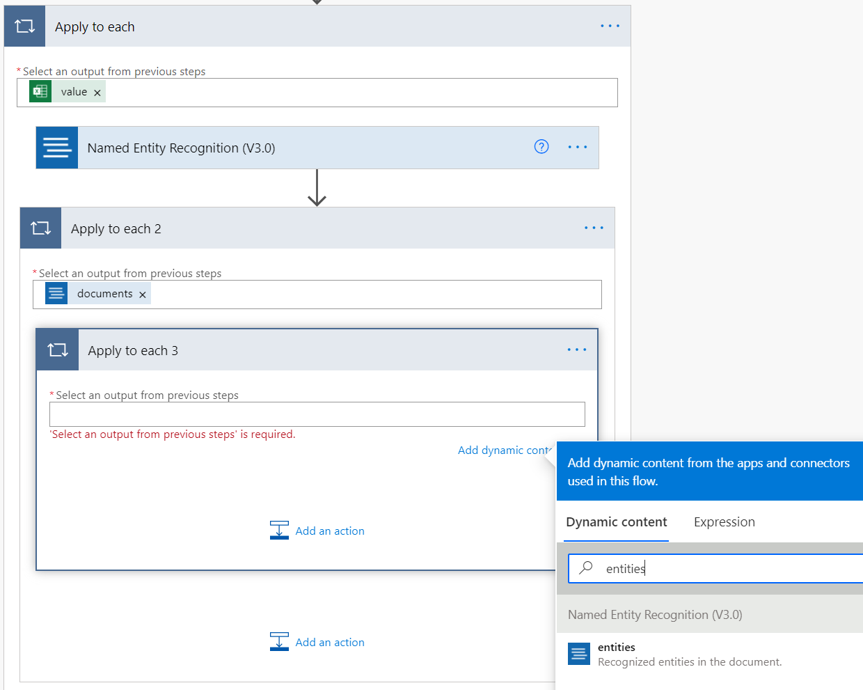 接下来,在 NER 输出中找到人员实体类型。 在“应用到每一个 2”中选择“添加操作”,然后再创建一个“应用到每一个”操作。 在文本框内进行选择,然后在出现的“动态内容”窗口中选择“实体”。