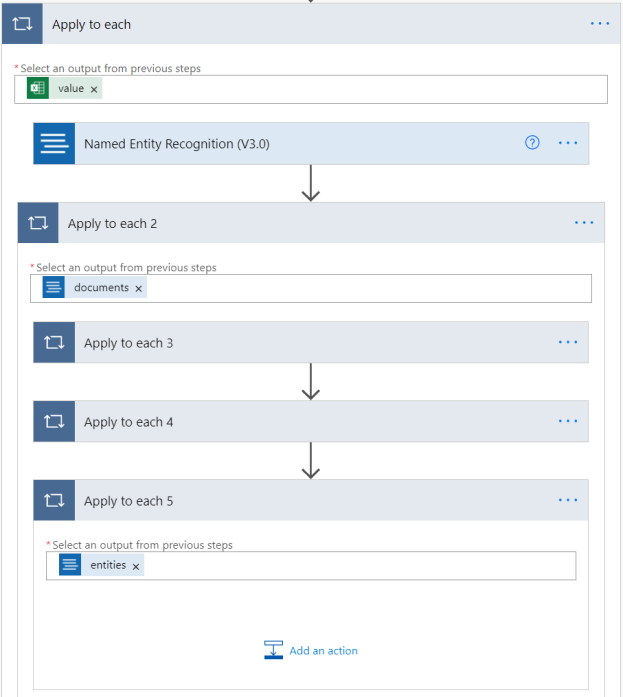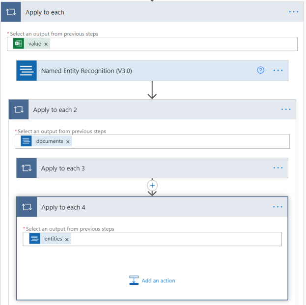 通过选择名称将应用于每个 3 操作最小化。 然后添加另一个 应用于每个 操作到 应用于每个 2,与之前相似,操作命名为 应用于每个 4。 选择文本框,并添加“实体”作为此操作的输出。
