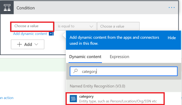 在“条件”窗口中,选择第一个文本框。 在“动态内容”窗口中搜索“类别”并选择它。