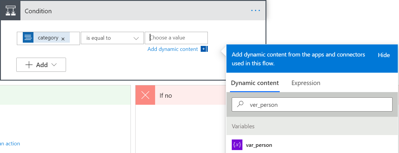 确保第二个框设为“等于”。 然后选择第三个框,并在“动态内容”窗口中搜索 var_person。