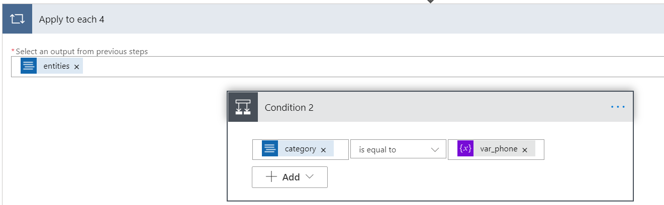 在“应用到每一个 4”中添加“条件”控件。 此控件名为 条件 2。 从第一个文本框的“动态内容”窗口中搜索并添加“类别”。 确保第中间框设为“等于”。 然后在右侧文本框中输入 var_phone。