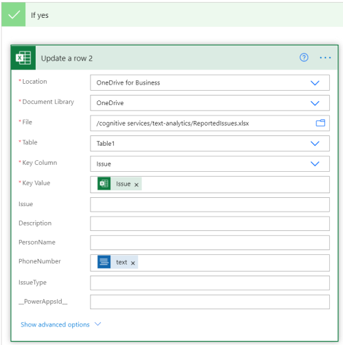 在“如果是”条件中添加“更新行”操作。 然后,按照我们之前所做的那样,为 Excel 工作表的电话号码列输入信息。 此步骤将 API 检测到的电话号码追加到 Excel 工作表。
