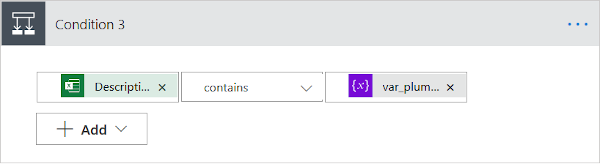 在“应用到每一个 4”操作中添加“条件”控件 。 它被命名为 条件 3。 在第一个文本框中,使用“动态内容”窗口搜索并添加 Excel 文件中的“说明”。 确保中间框显示“包含”。 然后在右侧文本框中查找并选择 var_plumbing。