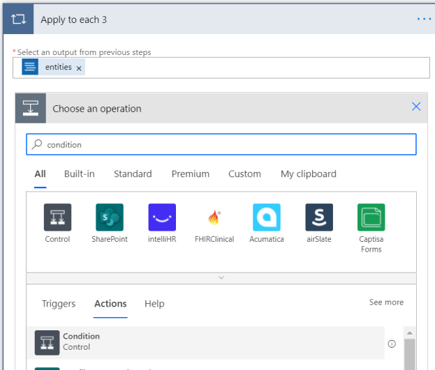 通过选择名称来最小化应用于每个 4。 然后在父操作中创建另一个“应用到每一个”操作。 选择文本框,从“动态内容”窗口添加“实体”作为此操作的输出。