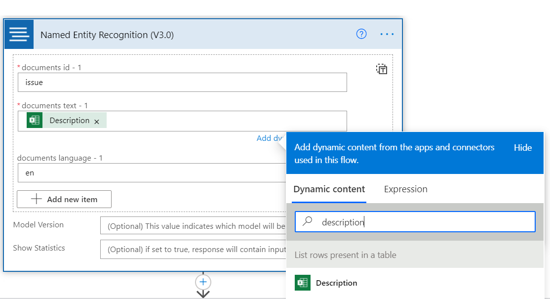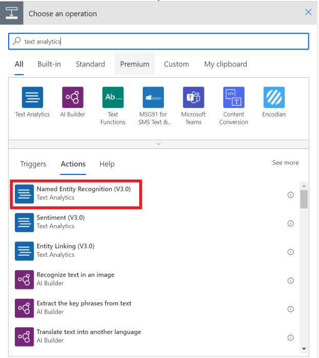 创建连接后,搜索“文本分析”并选择“命名实体识别”。 这会从问题的说明列中提取信息。
