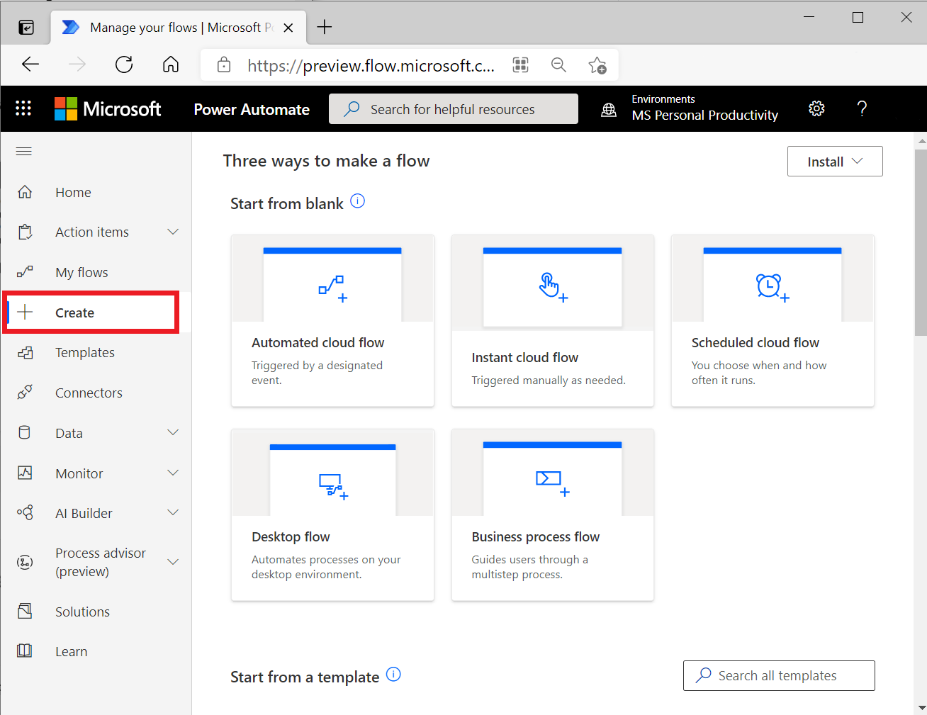 转到 Power Automate 站点并登录。 然后,选择“创建”和“计划的流”。