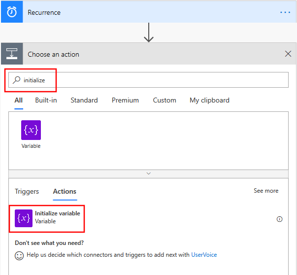 创建表示添加到 Excel 文件的信息的变量。 选择“新建步骤”并搜索“初始化变量”。 执行此作四次,并创建四个变量。