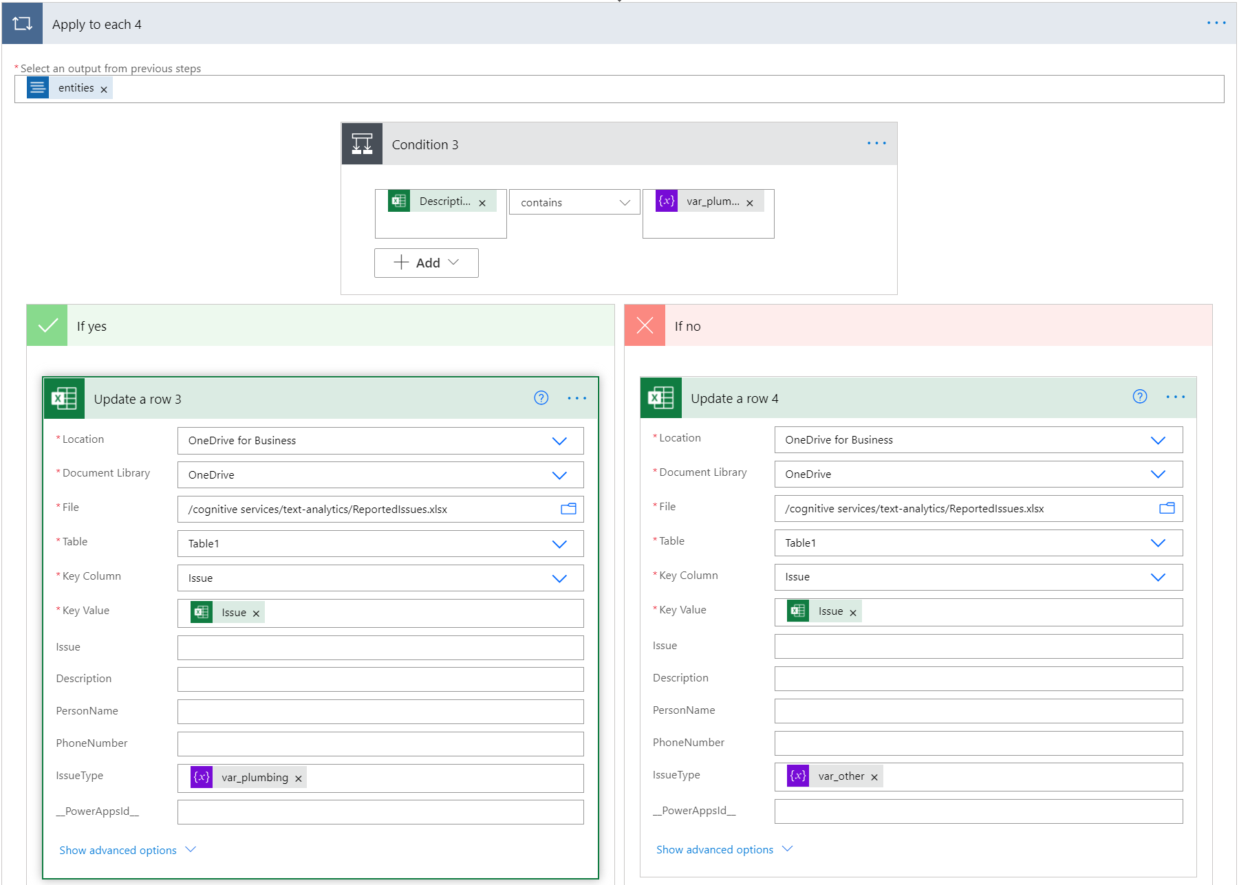 接下来,流检查 Excel 表格行中的问题说明是否包含“管道”一词。如果是,则会在 IssueType 列中添加“管道”。 否则,我们将输入“其他”选项。