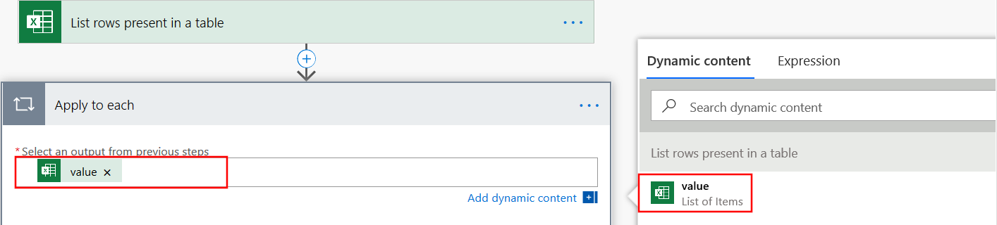 选择“从先前的步骤中选择一个输出”。 在显示的动态内容框中选择“值”。