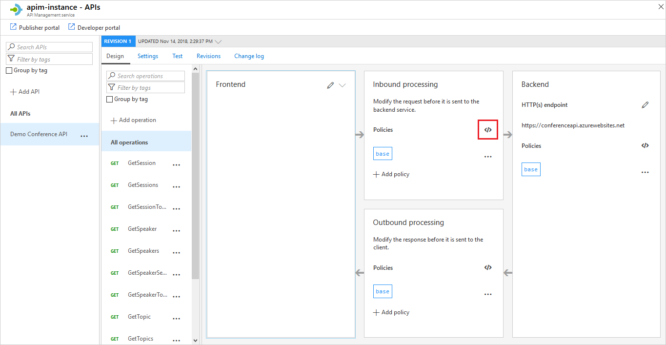 inbound元素中,添加以下策略:<cache-lookup vary-by-developer="false" vary-by-developer-groups="false"> <vary-by-header>Accept</vary-by-header> <vary-by-header>Accept-Charset</vary-by-header> <vary-by-header>Authorization</vary-by-header> </cache-lookup> <rate-limit calls="10" renewal-period="60" />在