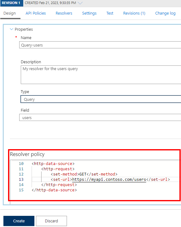 <http-data-source>例如,以下解析程序通过users调用现有 HTTP 数据源来检索GET字段。<http-data-source> <http-request> <set-method>GET</set-method> <set-url>https://myapi.contoso.com/users</set-url> </http-request> </http-data-source>选择“ 创建”。