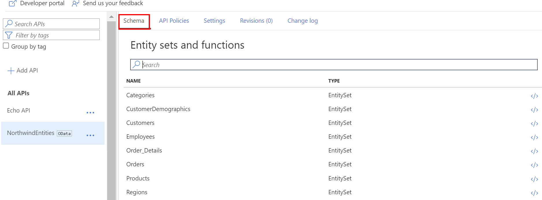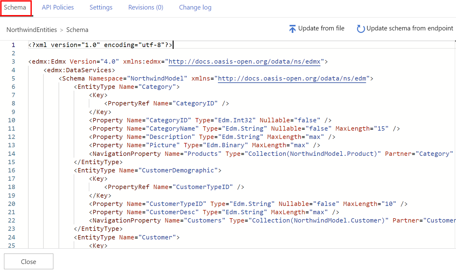 可以在门户中访问编辑器以查看 API 的 OData 架构。 如果 API 发生更改,还可以从文件或 OData 服务终结点更新 API 管理中的架构。
