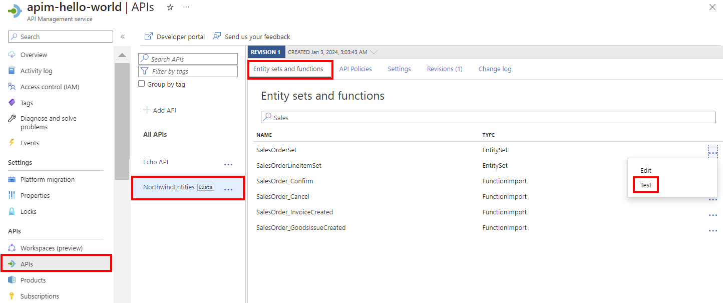 在 “实体集和函数 ”选项卡上,选择实体集或函数旁边的省略号(...),然后选择“ 测试”。