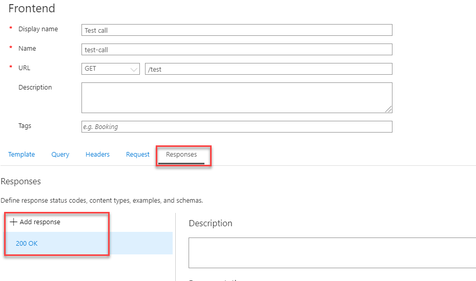 设置 值 说明 显示名称 测试调用 开发人员门户中显示的名称。 URL (第一个框) 获取 选择预定义的 HTTP 谓词之一。 URL (第二个框) /测试 API 的 URL 路径。 说明 操作的可选说明。 它向使用 API 的开发人员提供开发人员门户中的文档。 选择“响应”选项卡,该选项卡位于 URL、显示名称和“说明”框下。 你将在此选项卡上输入值来定义响应状态代码、内容类型、示例和架构。