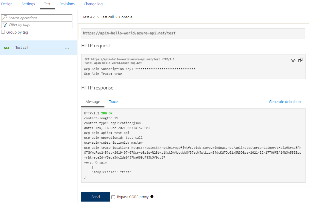 在“ 测试 ”选项卡上,确保已选择 “测试调用 API”,然后选择“ 发送 ”进行测试调用: