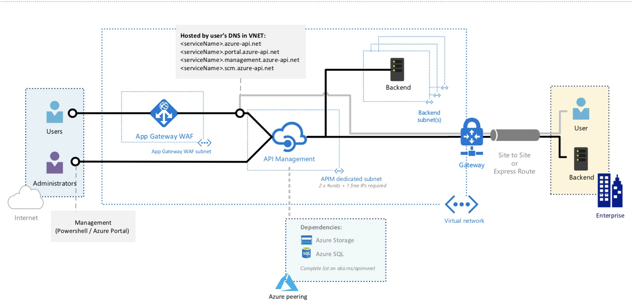 使用虚拟网络,你可以将开发人员门户、API 网关和其他 API 管理终结点配置为可从 Internet(外部模式)或仅在虚拟网络中(内部模式)访问。