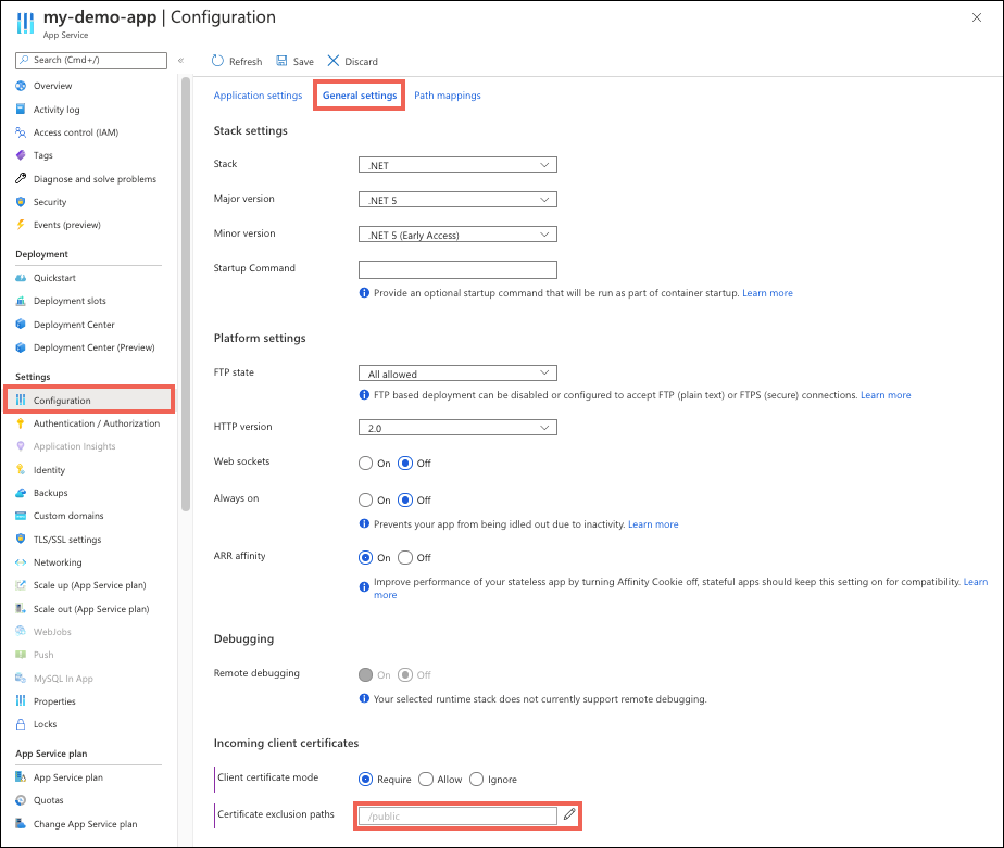 为应用程序启用相互身份验证时,应用根目录下的所有路径都需要客户端证书进行访问。 若要针对特定路径去除此要求,请在应用程序配置中定义排除路径。