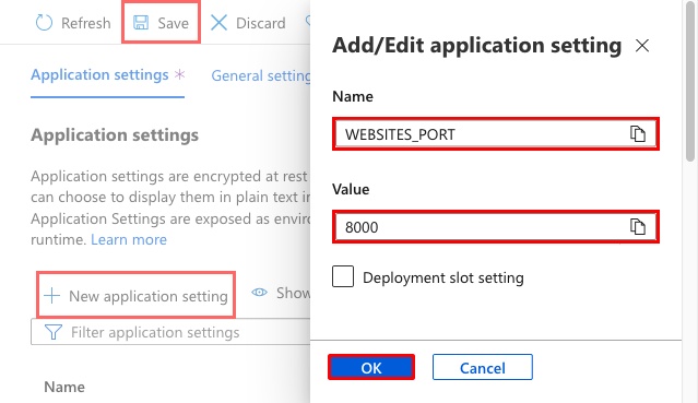 az webapp config appsettings set按应用代码的需要设置WEBSITES_PORT环境变量:az webapp config appsettings set --resource-group msdocs-custom-container-tutorial --name <app-name> --settings WEBSITES_PORT=8000将