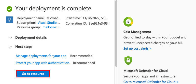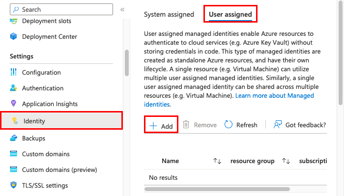 az webapp identity assign以下命令在 Web 应用中启用用户分配的托管标识:id=$(az identity show --resource-group msdocs-custom-container-tutorial --name myID --query id --output tsv) az webapp identity assign --resource-group msdocs-custom-container-tutorial --name <app-name> --identities $id将