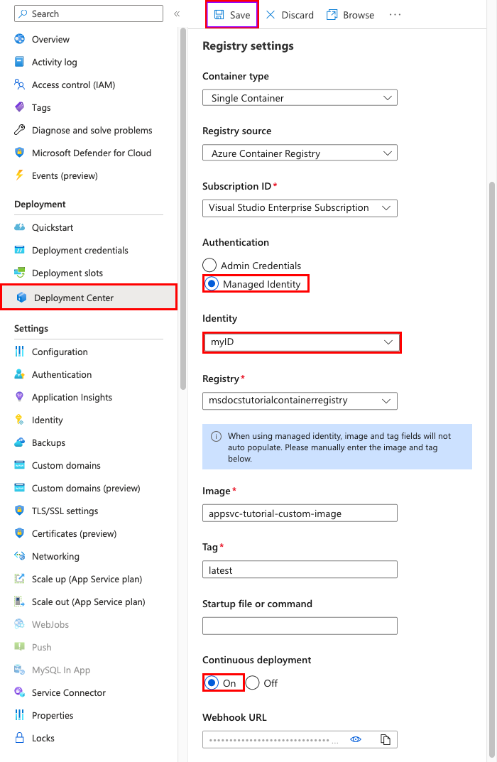 应用服务可以使用默认托管标识或用户分配的托管标识向容器注册表进行身份验证。 本教程使用用户分配的托管标识。