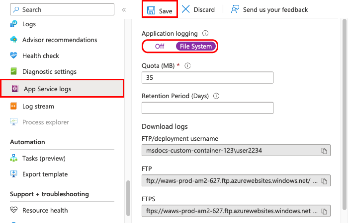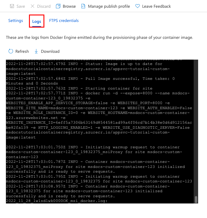 az webapp log config --name <app-name> --resource-group msdocs-custom-container-tutorial --docker-container-logging filesystem启用日志流: